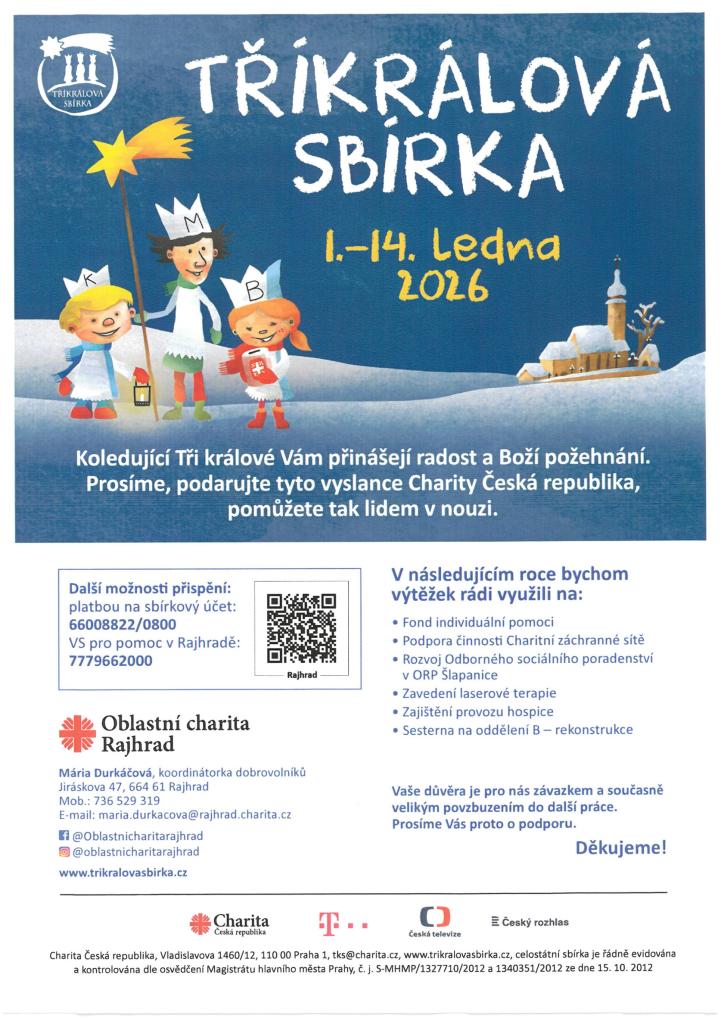 Tři králové přinášejí radost a boží požehnání. V období od 1. do 14. ledna 2026 vyjdou do ulic s tradiční kasičkou, sbírka bude probíhat též v online prostoru na tomto odkazu: https://rajhrad.charita.cz/trikralova-sbirka-2026/.