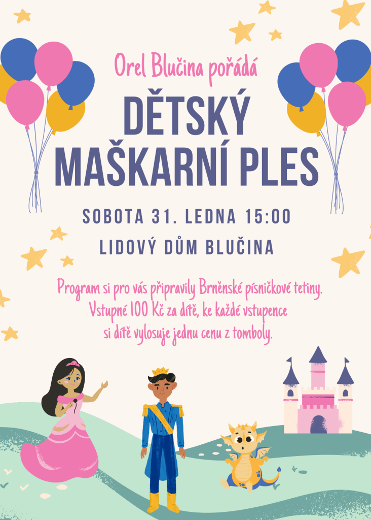 Orel Blučina srdečně zve na Dětský maškarní ples, který se uskuteční v sobotu 31. ledna 2026 od 15:00 v Lidovém domě Blučina. Všechny děti se mohou těšit na zábavný program, který pro ně připravily Brněnské písničkové tetiny. Přijďte si užít odpoledne plné zábavy a překvapení.